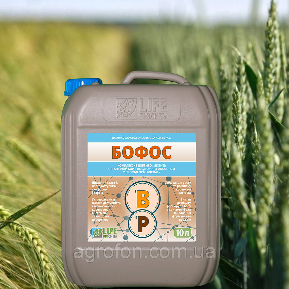 Рідкі добрива для зернових культур БОФОС - добрива, яке містить легкодоступний бір і фосфор у формі ортофосфату. Має високий ступінь поглинання та засвоєння за рахунок утримання легкодоступних елементів та органічних комплексів.